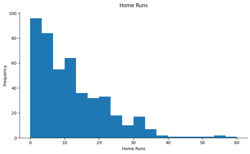 Look at the distribution of home runs in the 2025 season for players with at least 100 plate appearances (i.e., those who played at least ~15% of regular-season games). Most players have just a few home runs, and a handful of players make up a large share of the total. That’s a power law, all right.