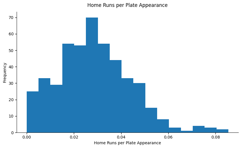 But the trouble with home runs is there’s a high exposure to opportunity. In other words, how many chances did a hitter have to hit a homer? For instance, over the course of a season, the number nine hitter in the lineup may expect over a hundred fewer at-bats than the leadoff hitter. We can control for that by looking at home runs per plate appearance. When we do, the distribution tightens and the tail shortens.