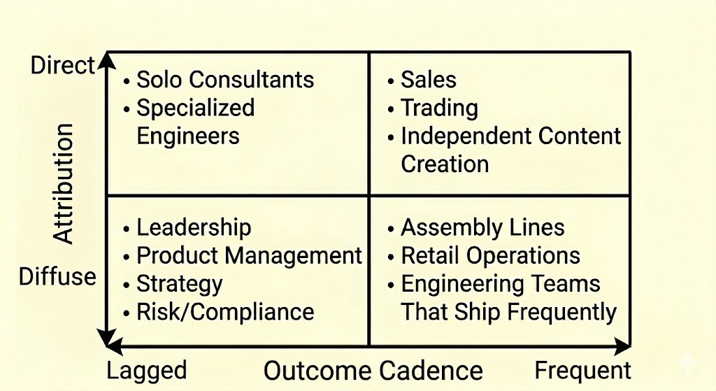 If skew is shaped by measurement and opportunity, then it makes sense that it should vary systematically by role. The two most critical features are: how frequently the work converts behavior into measurable, comparable outcomes, and how clearly those outcomes can be attributed to one individual.