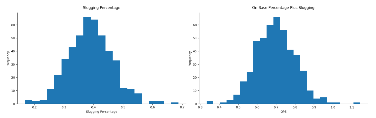 And look at the distributions of slugging percentage and OPS. Both pretty lovely normal curves.